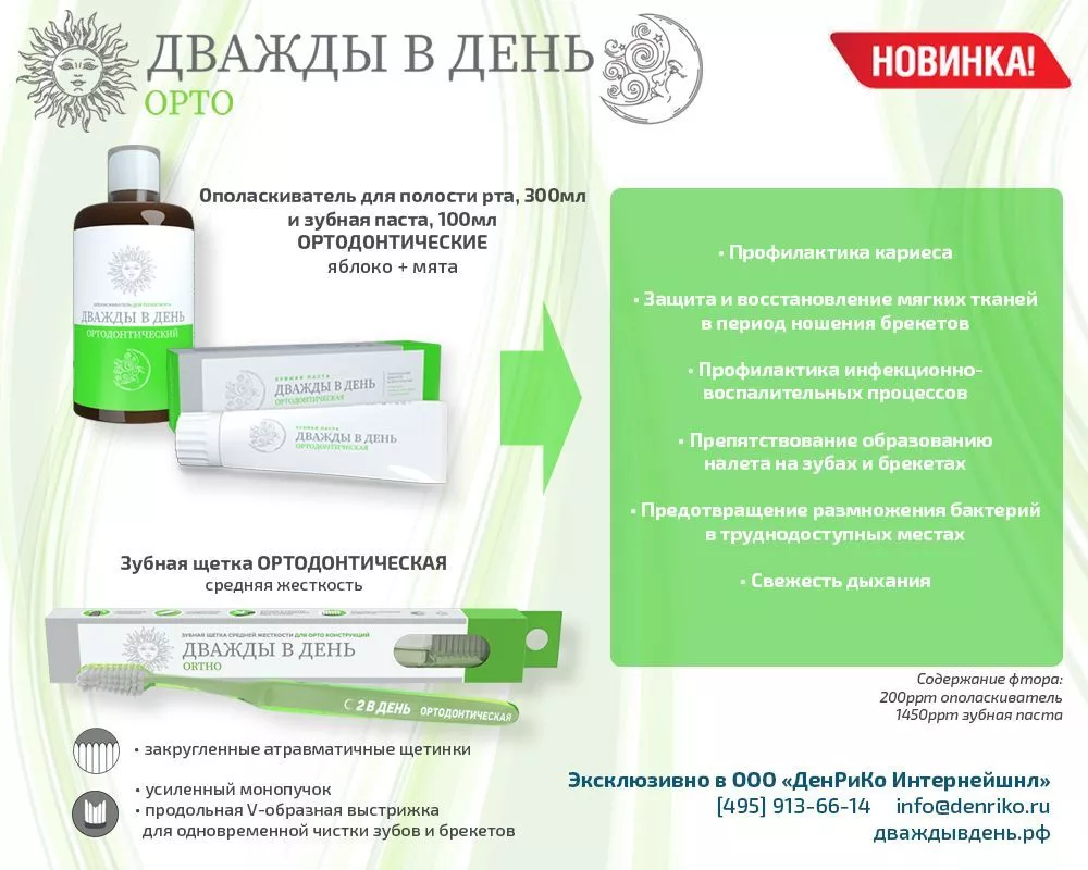 Продукция Дважды в День включает в себя полный набор средств гигиены по уходу за полостью рта, специализированную зубную пасту, щетку и ополаскиватель.