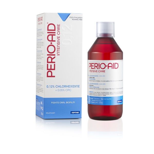 Ополаскиватель полости рта PERIO-AID® Intensive Care с содержанием хлоргексидина биглюконата 0,12% и цетилпиридиния хлорида 0,05%. НЕ СОДЕРЖИТ СПИРТ.